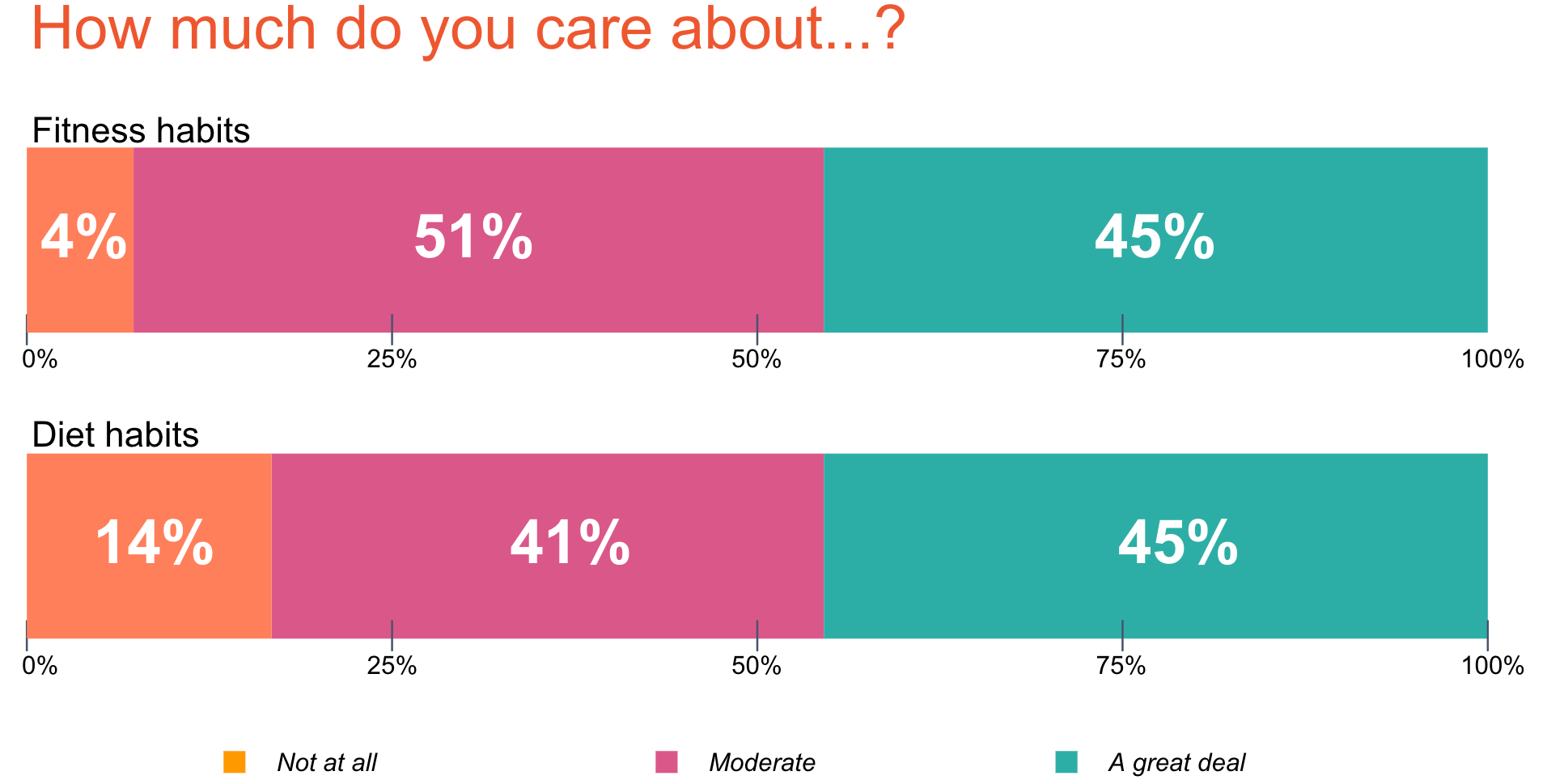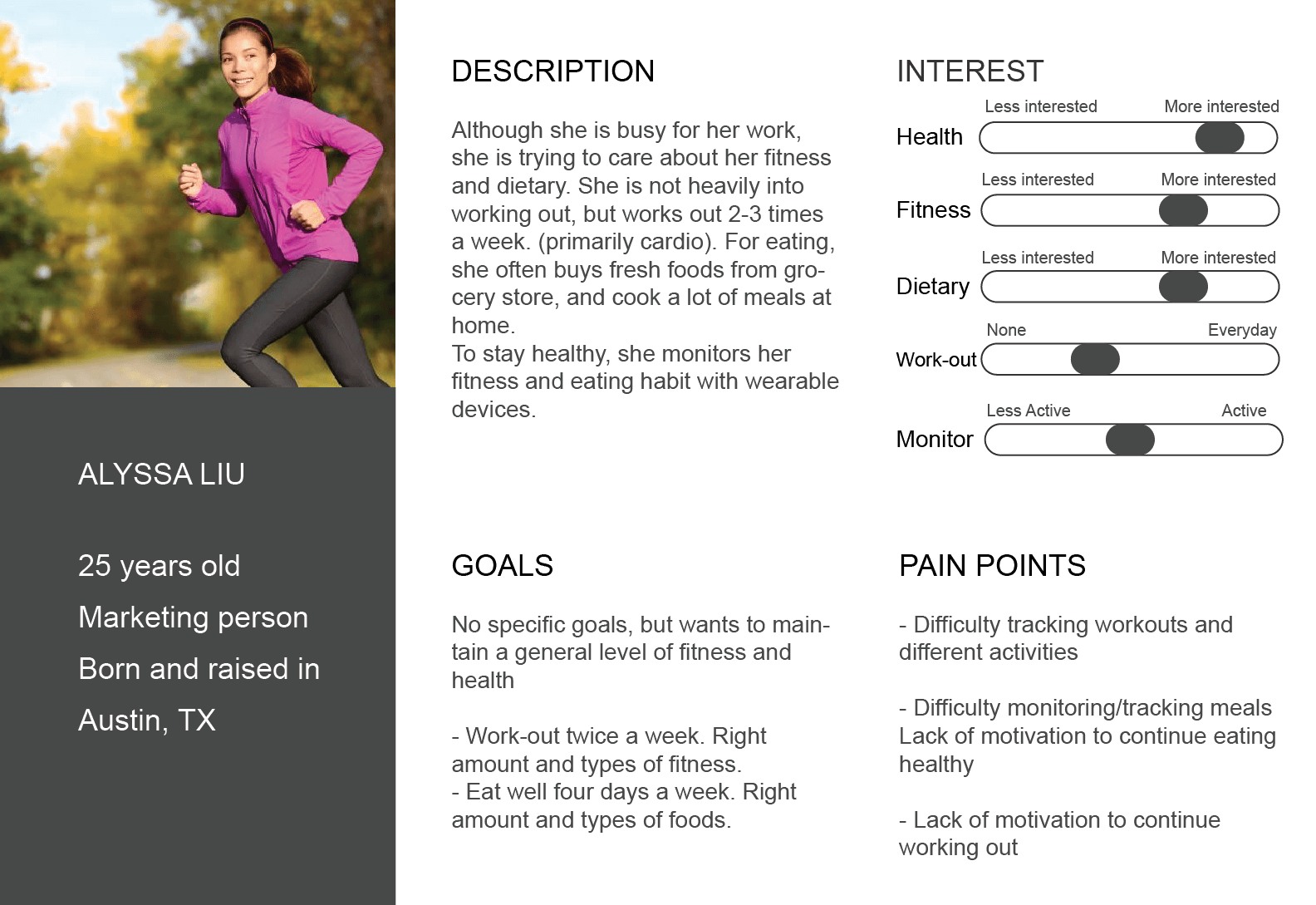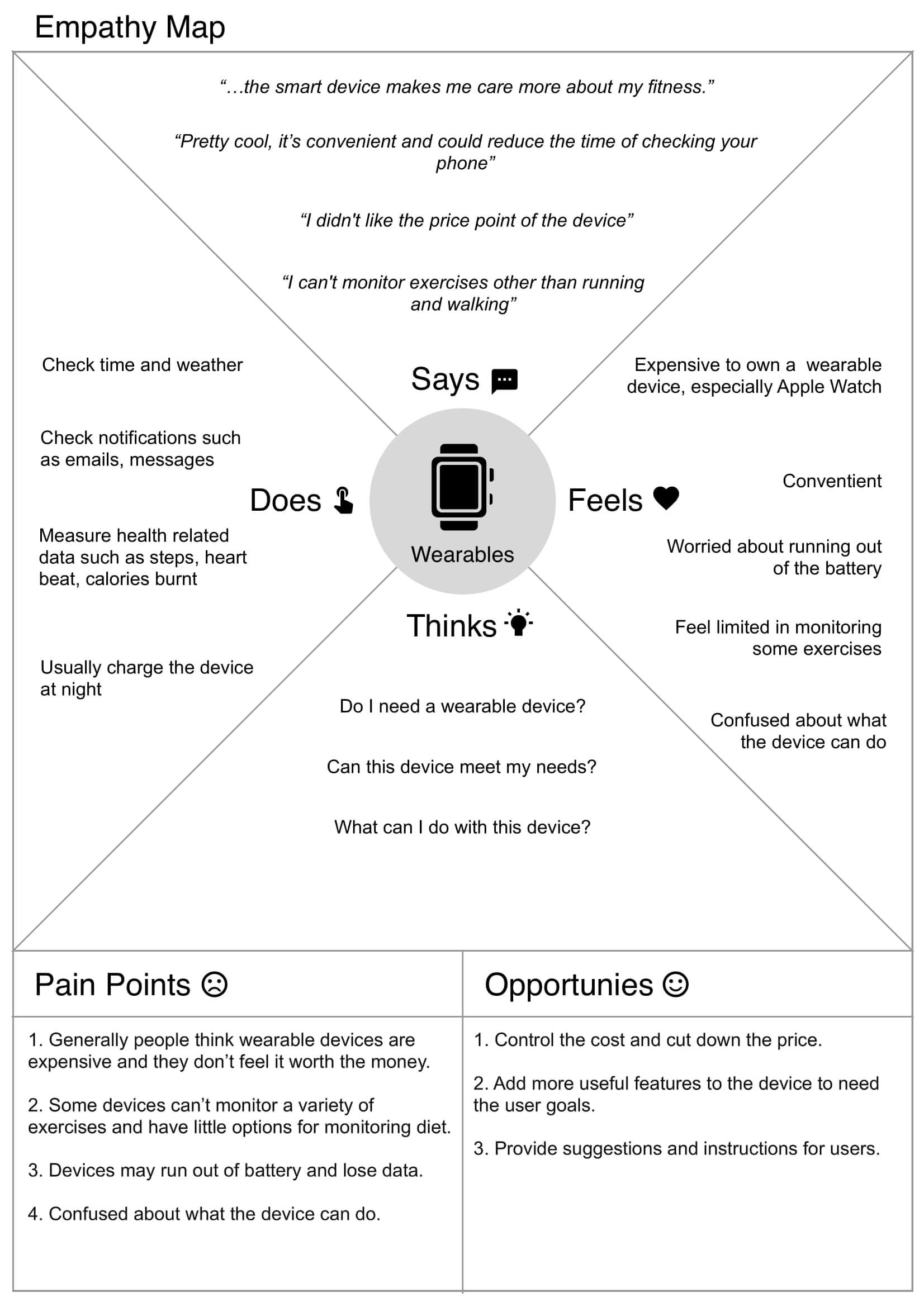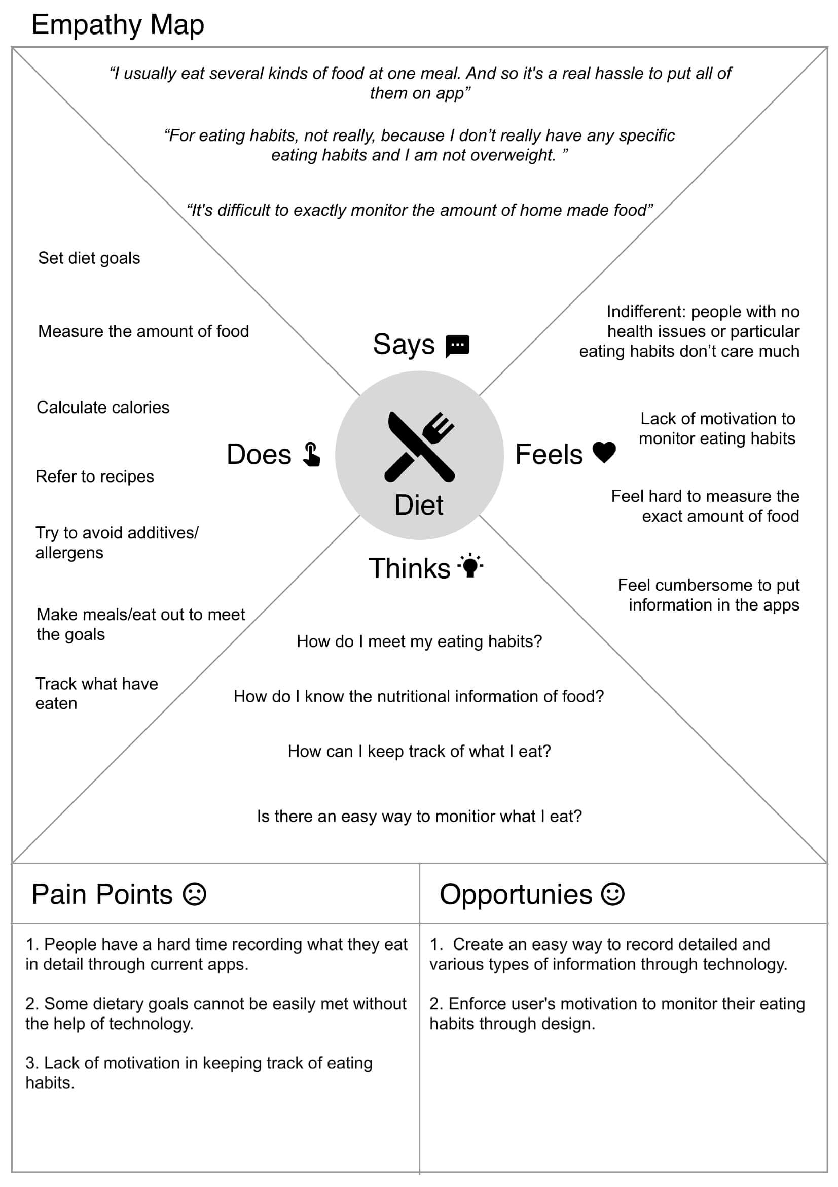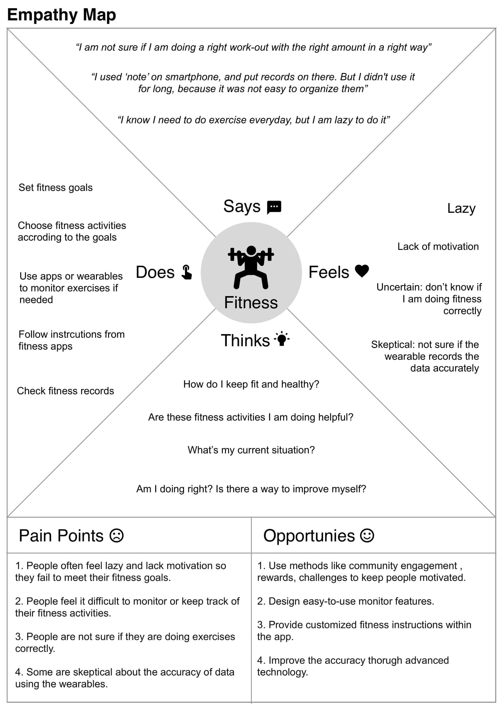 Our suvery results indicate most of people care about their fitness and diet, but struggle to manage them well. I visualized the user research with empathy mapping.